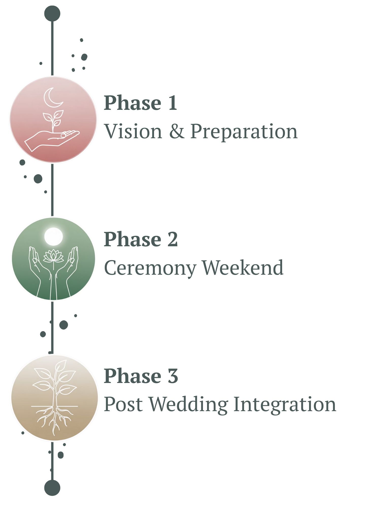 From there, we walk alongside you through every phase: planning, preparation, energetic clearing, ceremony co-creation, vendor coordination, timeline design, and finally, the ceremony weekend itself. You're never alone in this process. We're with you the whole way.